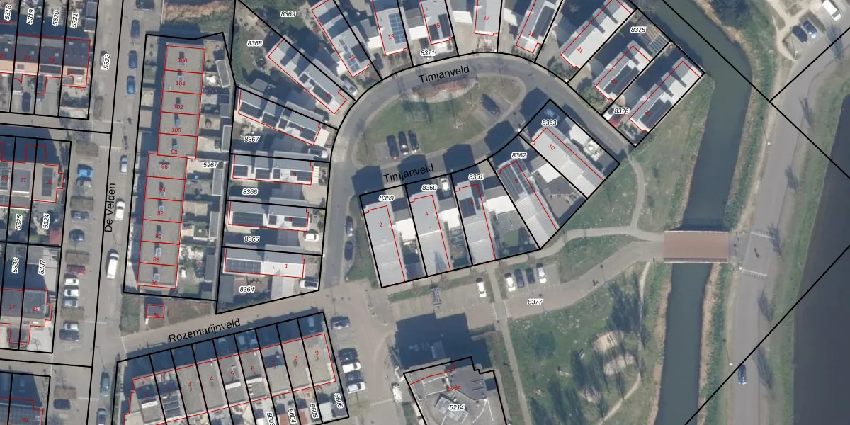 Timjanveld 4 is gelegen op kadastraal perceel SDM01Q8360. Deze kadastrale aanduiding is uniek en wordt gebruikt door het Kadaster om eigendomsrechten en andere zakelijke rechten vast te leggen. Het perceel maakt onderdeel uit van de kadastrale gemeente Schiedam.