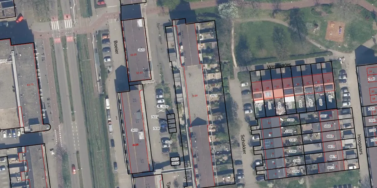 Het adres ligt op het perceel SDM01-Q-3421, dat zich in de kadastrale gemeente Schiedam bevindt. Het perceel is met 2280 m² relatief groot. Het gemiddelde ligt in de kadastrale gemeente Schiedam op 1011,07 m². De grootste perceeloppervlakte in de kadastrale gemeente is 53,5 ha. De kleinste oppervlakte bedraagt 0 m². Er zijn 32 adressen aanwezig op het perceel. De laatste wijziging in het de Basisregistratie Kadaster (BRK) was op 08-11-2005.