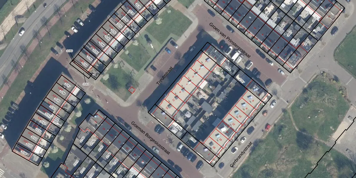 Het perceel waarop Treubstraat 9 staat heeft een oppervlakte van 1891 m². Dit is een zeer groot perceel. De perceeloppervlakte wordt geregistreerd door het Kadaster. Gedetailleerde informatie over de maten van dit perceel kunt u vinden in het rapport Kadastrale kaart met maatvoering van Treubstraat 9.
