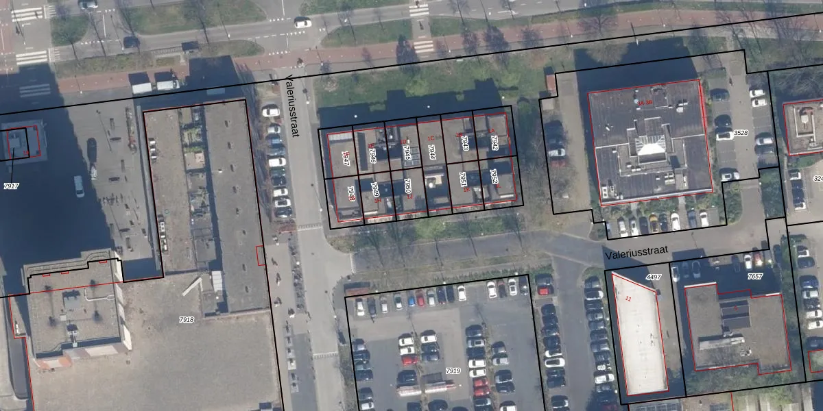 Het perceel waarop Valeriusstraat 1-J staat heeft een oppervlakte van 96 m². Dit is een klein perceel. De perceeloppervlakte wordt geregistreerd door het Kadaster. Gedetailleerde informatie over de maten van dit perceel kunt u vinden in het rapport Kadastrale kaart met maatvoering van Valeriusstraat 1-J.