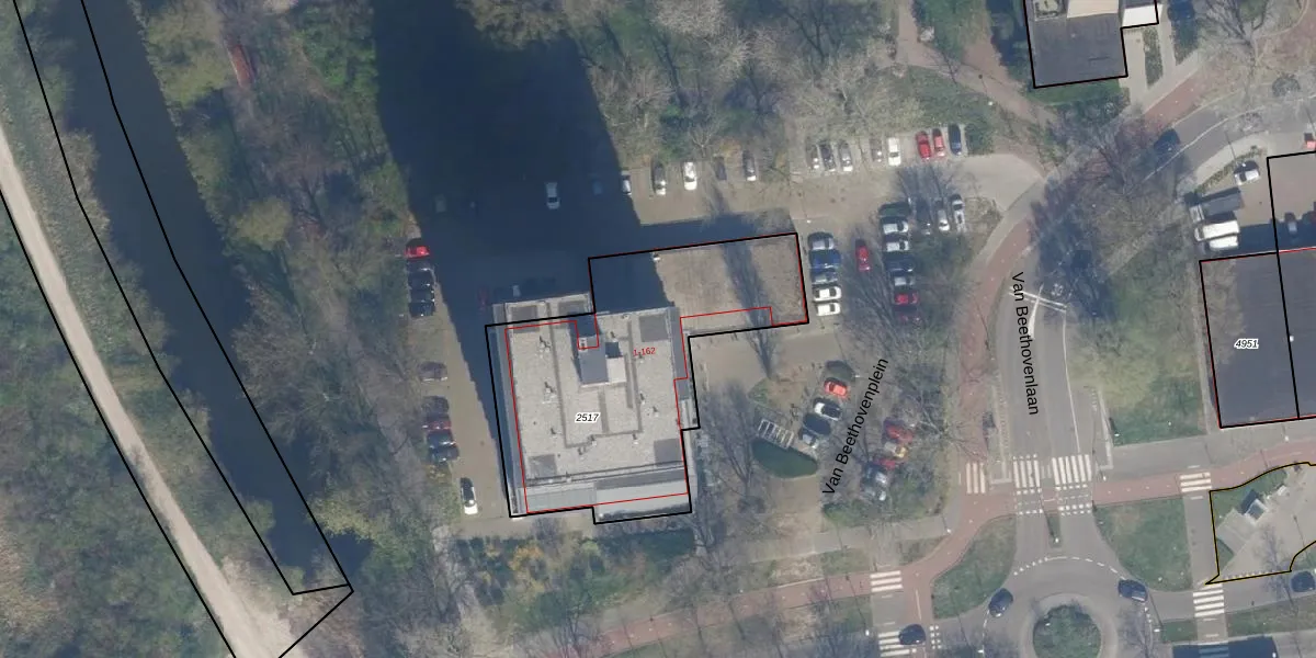 Het perceel waarop Van Beethovenplein 85 staat heeft een oppervlakte van 1262 m². Dit is een zeer groot perceel. De perceeloppervlakte wordt geregistreerd door het Kadaster. Gedetailleerde informatie over de maten van dit perceel kunt u vinden in het rapport Kadastrale kaart met maatvoering van Van Beethovenplein 85.