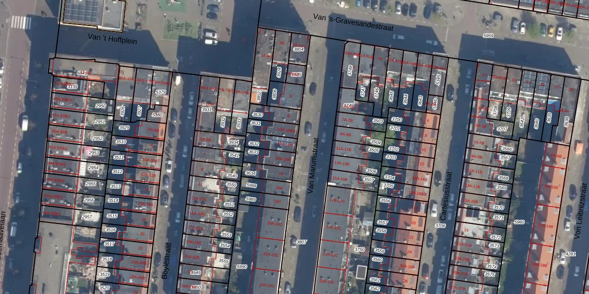 Het perceel waarop Van Marumstraat 12-B staat heeft een oppervlakte van 88 m². Dit is een klein perceel. De perceeloppervlakte wordt geregistreerd door het Kadaster. Gedetailleerde informatie over de maten van dit perceel kunt u vinden in het rapport Kadastrale kaart met maatvoering van Van Marumstraat 12-B.
