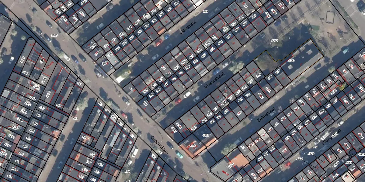 Het perceel waarop Visserstraat 7 staat heeft een oppervlakte van 55 m². Dit is een klein perceel. De perceeloppervlakte wordt geregistreerd door het Kadaster. Gedetailleerde informatie over de maten van dit perceel kunt u vinden in het rapport Kadastrale kaart met maatvoering van Visserstraat 7.