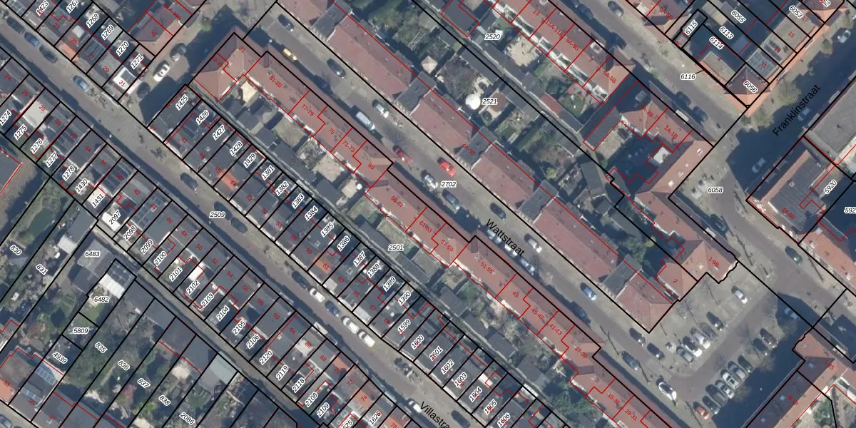Het perceel waarop Wattstraat 61 staat heeft een oppervlakte van 2639 m². Dit is een zeer groot perceel. De perceeloppervlakte wordt geregistreerd door het Kadaster. Gedetailleerde informatie over de maten van dit perceel kunt u vinden in het rapport Kadastrale kaart met maatvoering van Wattstraat 61.