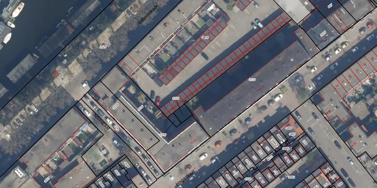 Het perceel waarop Willemskade 105-B staat heeft een oppervlakte van 3675 m². Dit is een zeer groot perceel. De perceeloppervlakte wordt geregistreerd door het Kadaster. Gedetailleerde informatie over de maten van dit perceel kunt u vinden in het rapport Kadastrale kaart met maatvoering van Willemskade 105-B.
