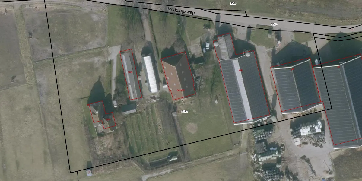 Het perceel waarop Reddingsweg 38 staat heeft een oppervlakte van 1,0 ha. Dit is een zeer groot perceel. De perceeloppervlakte wordt geregistreerd door het Kadaster. Gedetailleerde informatie over de maten van dit perceel kunt u vinden in het rapport Kadastrale kaart met maatvoering van Reddingsweg 38.