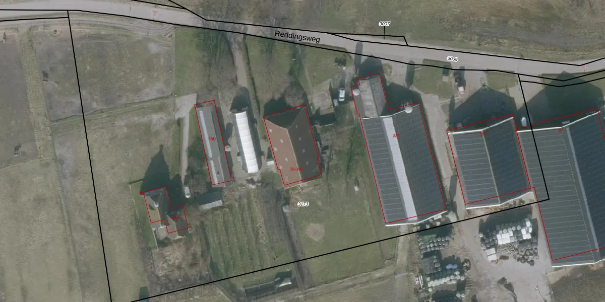 Het perceel waarop Reddingsweg 38-J staat heeft een oppervlakte van 1,0 ha. Dit is een zeer groot perceel. De perceeloppervlakte wordt geregistreerd door het Kadaster. Gedetailleerde informatie over de maten van dit perceel kunt u vinden in het rapport Kadastrale kaart met maatvoering van Reddingsweg 38-J.
