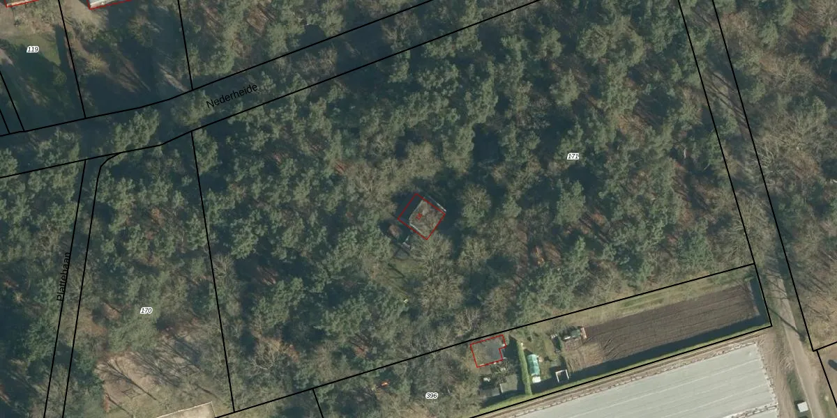 Het perceel waarop Nederheide 1-B staat heeft een oppervlakte van 8910 m². Dit is een zeer groot perceel. De perceeloppervlakte wordt geregistreerd door het Kadaster. Gedetailleerde informatie over de maten van dit perceel kunt u vinden in het rapport Kadastrale kaart met maatvoering van Nederheide 1-B.