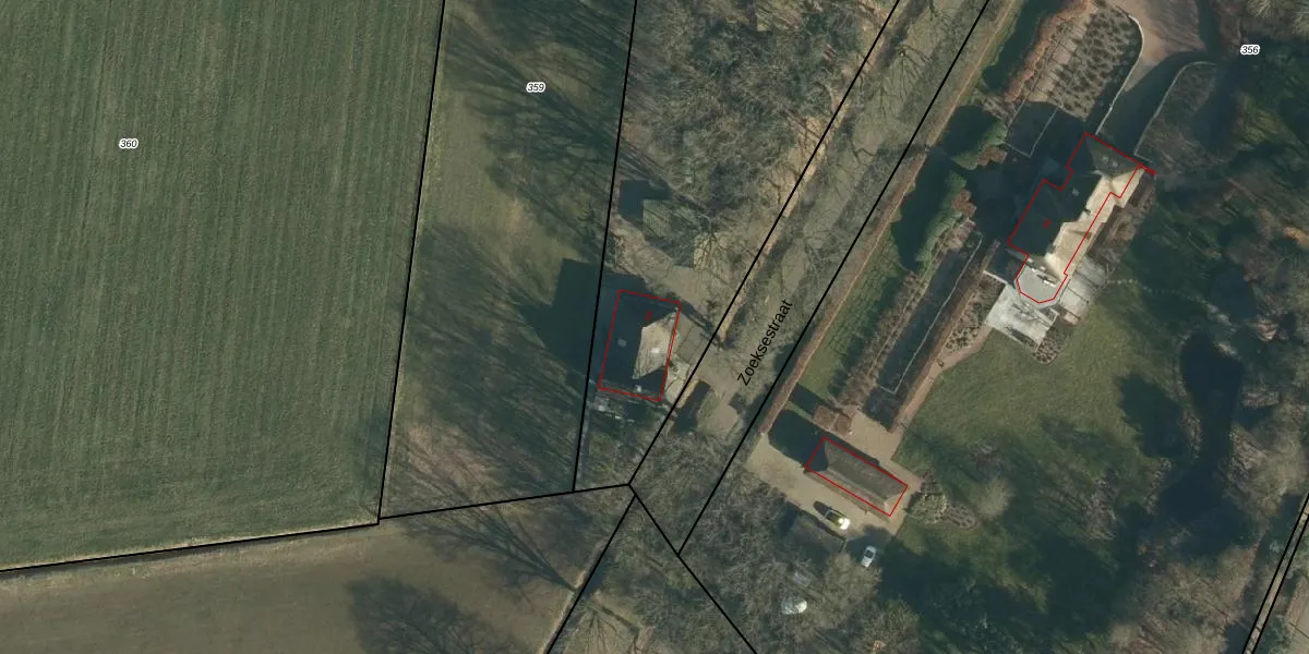 Het perceel waarop Zoeksestraat 22 staat heeft een oppervlakte van 5390 m². Dit is een zeer groot perceel. De perceeloppervlakte wordt geregistreerd door het Kadaster. Gedetailleerde informatie over de maten van dit perceel kunt u vinden in het rapport Kadastrale kaart met maatvoering van Zoeksestraat 22.