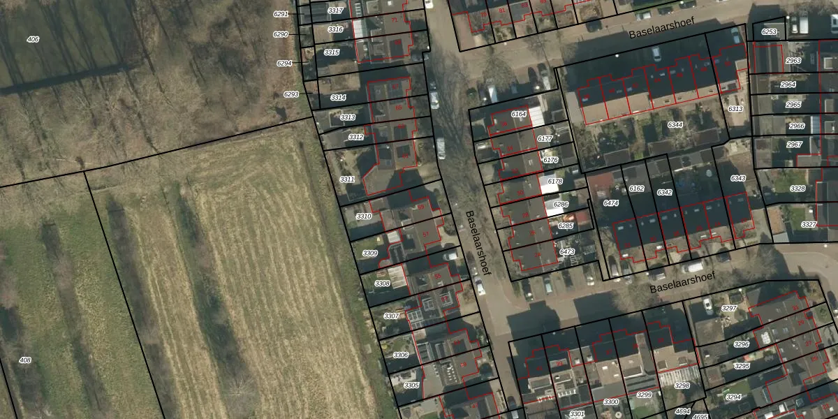 Baselaarshoef 59 is gelegen op kadastraal perceel SDL00H3310. Deze kadastrale aanduiding is uniek en wordt gebruikt door het Kadaster om eigendomsrechten en andere zakelijke rechten vast te leggen. Het perceel maakt onderdeel uit van de kadastrale gemeente Schijndel.