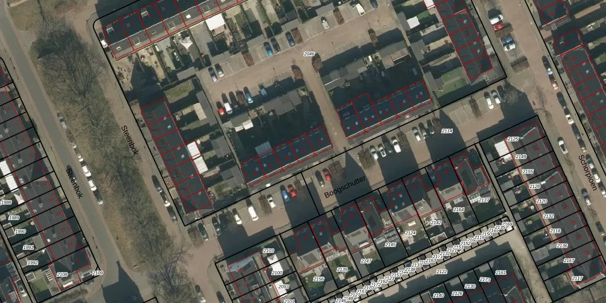 Het perceel waarop Boogschutter 55 staat heeft een oppervlakte van 8665 m². Dit is een zeer groot perceel. De perceeloppervlakte wordt geregistreerd door het Kadaster. Gedetailleerde informatie over de maten van dit perceel kunt u vinden in het rapport Kadastrale kaart met maatvoering van Boogschutter 55.