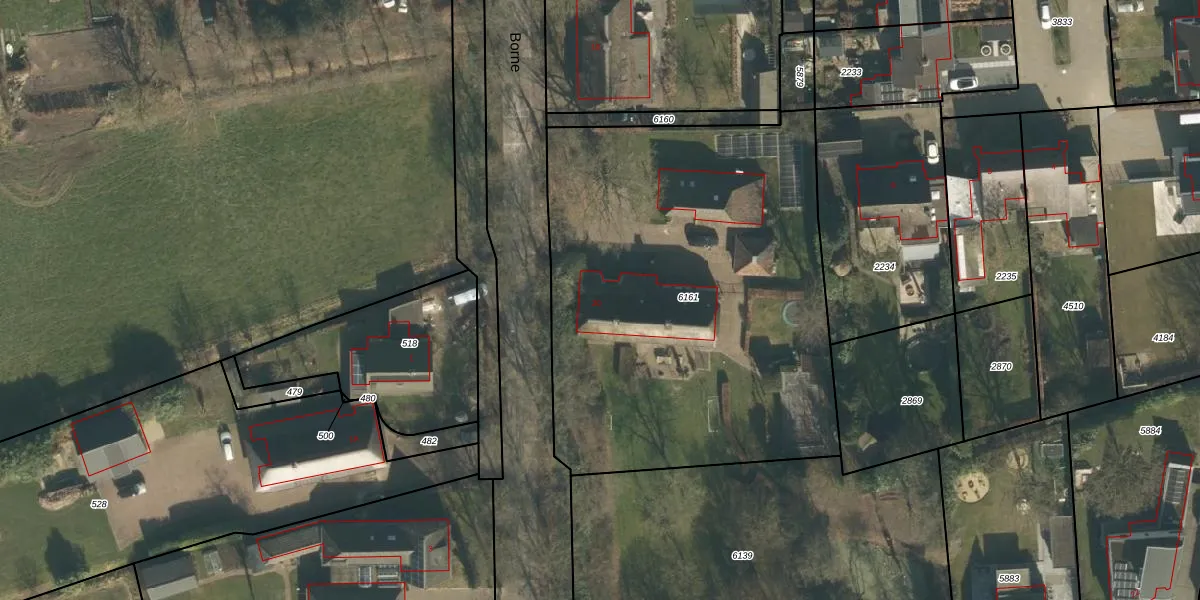 Het perceel waarop Borne 20 staat heeft een oppervlakte van 2615 m². Dit is een zeer groot perceel. De perceeloppervlakte wordt geregistreerd door het Kadaster. Gedetailleerde informatie over de maten van dit perceel kunt u vinden in het rapport Kadastrale kaart met maatvoering van Borne 20.