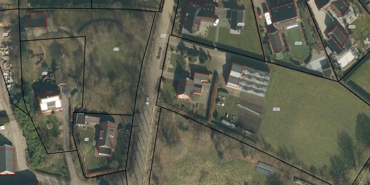 Het perceel waarop Borne 30 staat heeft een oppervlakte van 5525 m². Dit is een zeer groot perceel. De perceeloppervlakte wordt geregistreerd door het Kadaster. Gedetailleerde informatie over de maten van dit perceel kunt u vinden in het rapport Kadastrale kaart met maatvoering van Borne 30.