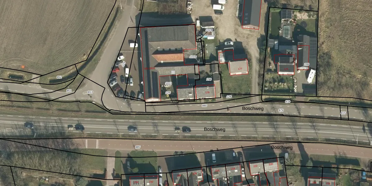 Boschweg 181-A is gelegen op kadastraal perceel SDL00K1013. Deze kadastrale aanduiding is uniek en wordt gebruikt door het Kadaster om eigendomsrechten en andere zakelijke rechten vast te leggen. Het perceel maakt onderdeel uit van de kadastrale gemeente Schijndel.
