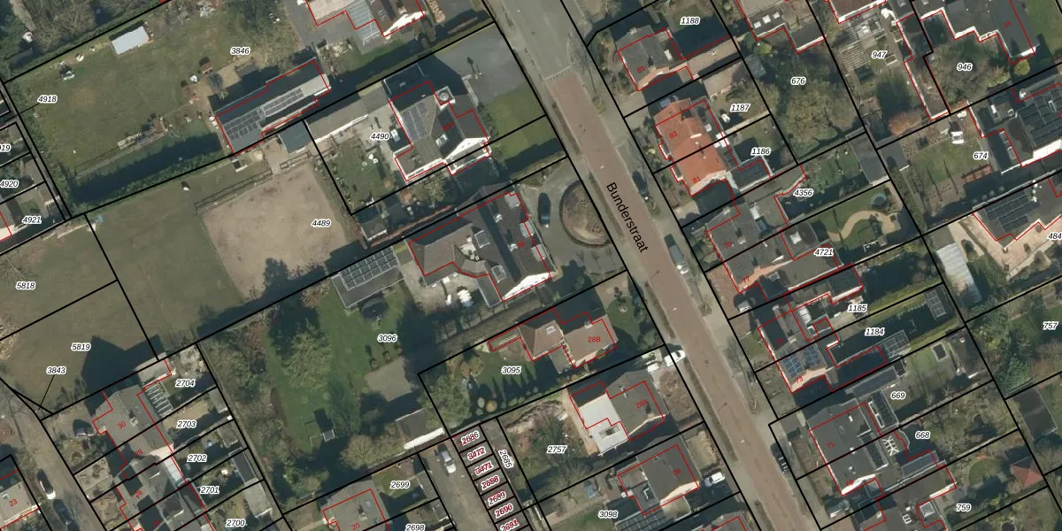 Het perceel waarop Bunderstraat 30 staat heeft een oppervlakte van 2351 m². Dit is een zeer groot perceel. De perceeloppervlakte wordt geregistreerd door het Kadaster. Gedetailleerde informatie over de maten van dit perceel kunt u vinden in het rapport Kadastrale kaart met maatvoering van Bunderstraat 30.