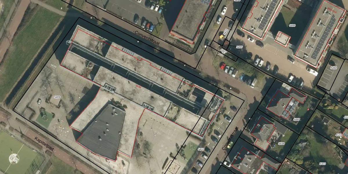 Het perceel waarop Conventstraat 24 staat heeft een oppervlakte van 6575 m². Dit is een zeer groot perceel. De perceeloppervlakte wordt geregistreerd door het Kadaster. Gedetailleerde informatie over de maten van dit perceel kunt u vinden in het rapport Kadastrale kaart met maatvoering van Conventstraat 24.