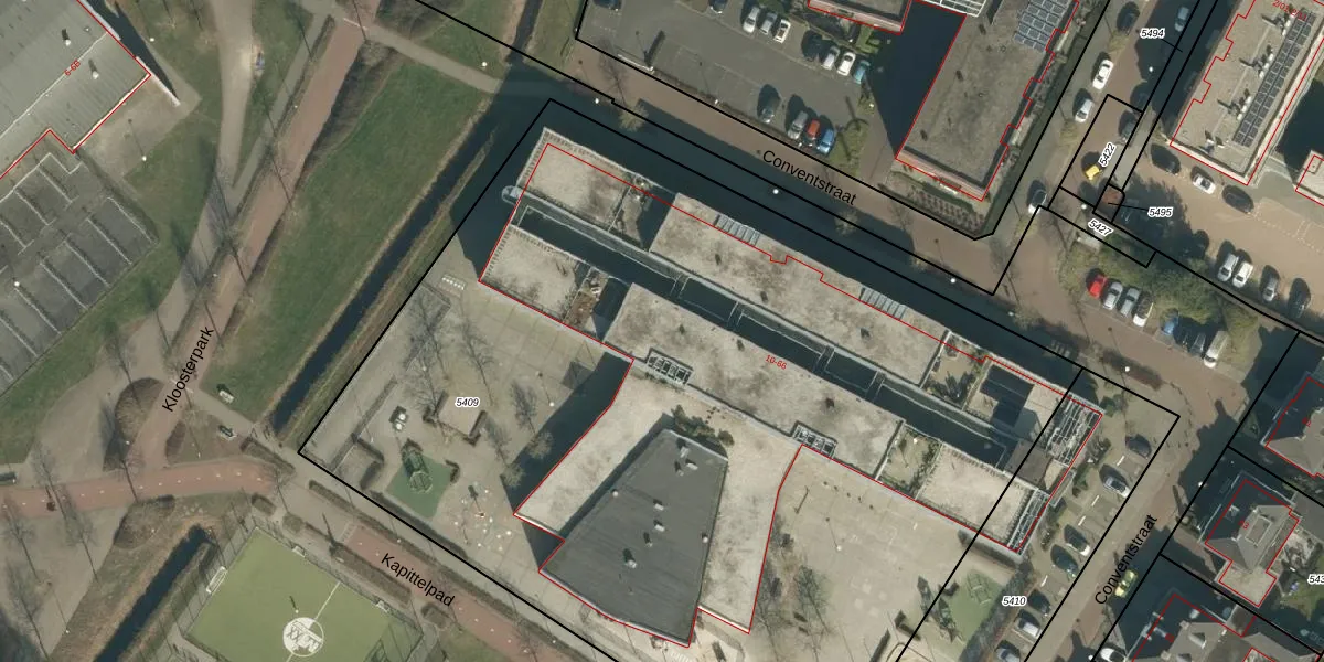 Het perceel waarop Conventstraat 40 staat heeft een oppervlakte van 6575 m². Dit is een zeer groot perceel. De perceeloppervlakte wordt geregistreerd door het Kadaster. Gedetailleerde informatie over de maten van dit perceel kunt u vinden in het rapport Kadastrale kaart met maatvoering van Conventstraat 40.