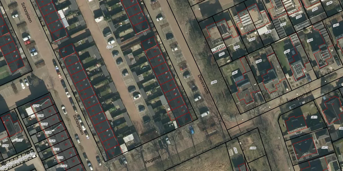 Het perceel waarop Dierenriem 64 staat heeft een oppervlakte van 7110 m². Dit is een zeer groot perceel. De perceeloppervlakte wordt geregistreerd door het Kadaster. Gedetailleerde informatie over de maten van dit perceel kunt u vinden in het rapport Kadastrale kaart met maatvoering van Dierenriem 64.