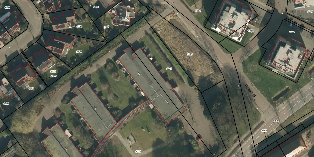 Het perceel waarop Eekelhof 51 staat heeft een oppervlakte van 1650 m². Dit is een zeer groot perceel. De perceeloppervlakte wordt geregistreerd door het Kadaster. Gedetailleerde informatie over de maten van dit perceel kunt u vinden in het rapport Kadastrale kaart met maatvoering van Eekelhof 51.