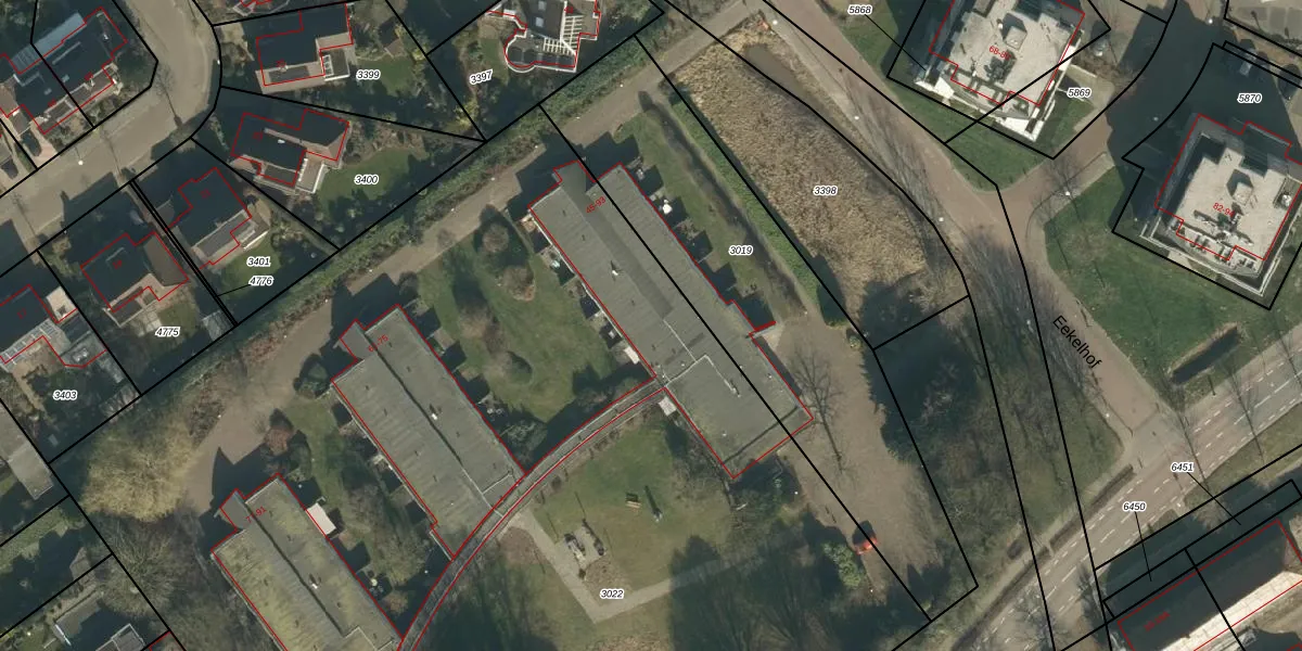 Het perceel waarop Eekelhof 53 staat heeft een oppervlakte van 9569 m². Dit is een zeer groot perceel. De perceeloppervlakte wordt geregistreerd door het Kadaster. Gedetailleerde informatie over de maten van dit perceel kunt u vinden in het rapport Kadastrale kaart met maatvoering van Eekelhof 53.