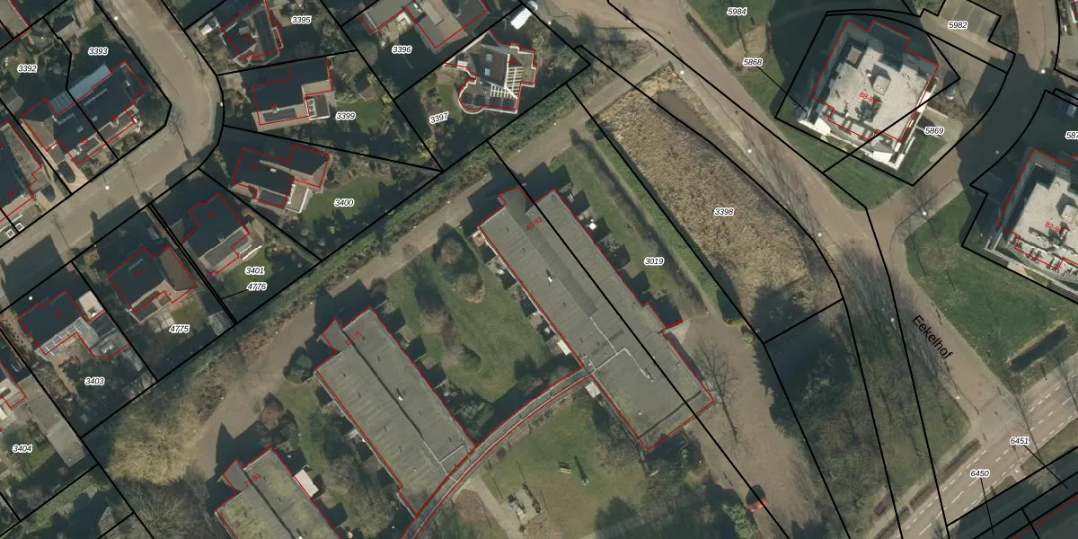 Het perceel waarop Eekelhof 57 staat heeft een oppervlakte van 9569 m². Dit is een zeer groot perceel. De perceeloppervlakte wordt geregistreerd door het Kadaster. Gedetailleerde informatie over de maten van dit perceel kunt u vinden in het rapport Kadastrale kaart met maatvoering van Eekelhof 57.