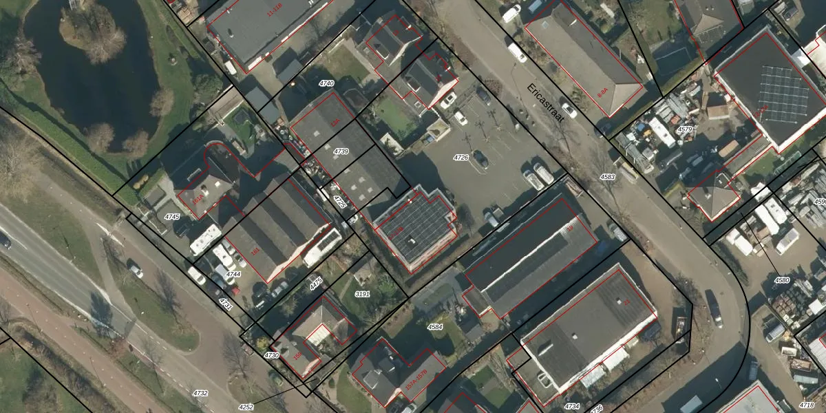 Het perceel waarop Ericastraat 17-A staat heeft een oppervlakte van 1716 m². Dit is een zeer groot perceel. De perceeloppervlakte wordt geregistreerd door het Kadaster. Gedetailleerde informatie over de maten van dit perceel kunt u vinden in het rapport Kadastrale kaart met maatvoering van Ericastraat 17-A.