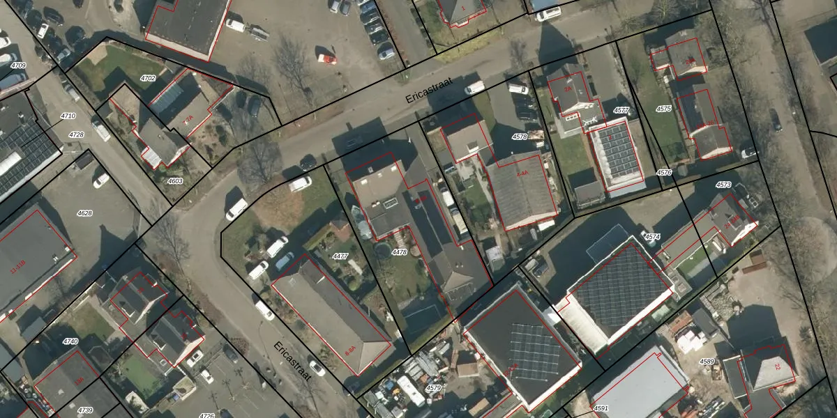 Ericastraat 6 is gelegen op kadastraal perceel SDL00B4478. Deze kadastrale aanduiding is uniek en wordt gebruikt door het Kadaster om eigendomsrechten en andere zakelijke rechten vast te leggen. Het perceel maakt onderdeel uit van de kadastrale gemeente Schijndel.