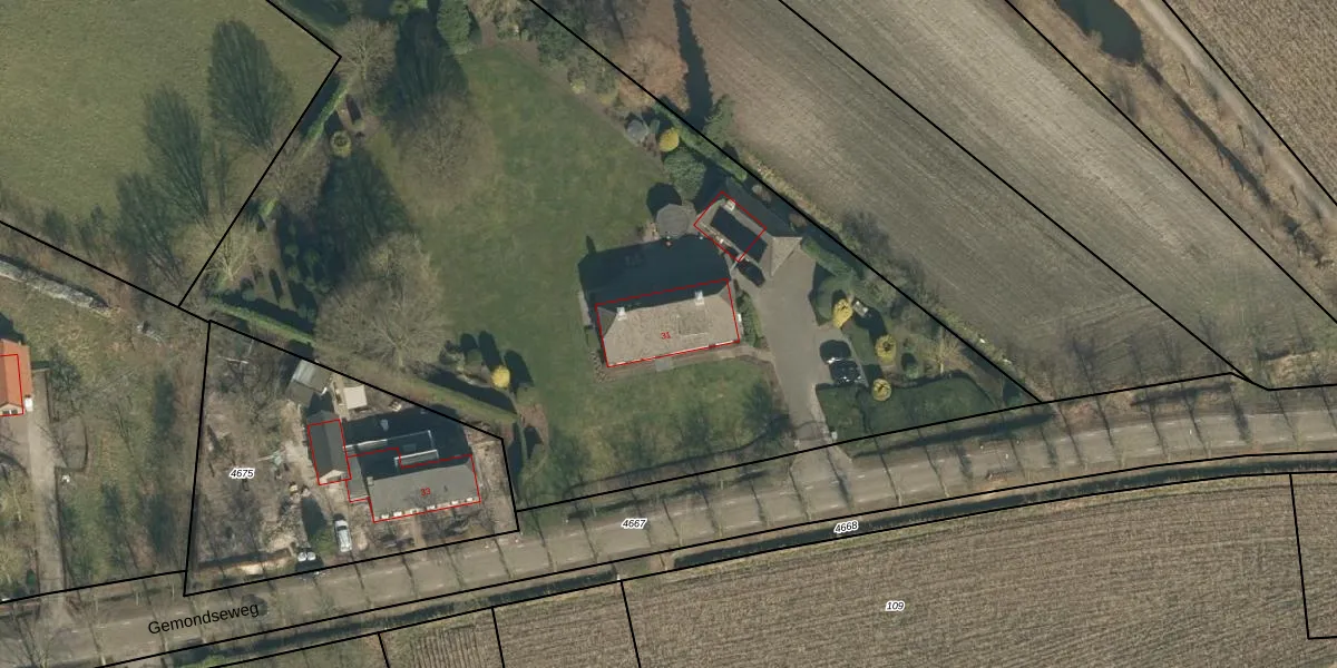 Het perceel waarop Gemondseweg 31 staat heeft een oppervlakte van 6210 m². Dit is een zeer groot perceel. De perceeloppervlakte wordt geregistreerd door het Kadaster. Gedetailleerde informatie over de maten van dit perceel kunt u vinden in het rapport Kadastrale kaart met maatvoering van Gemondseweg 31.