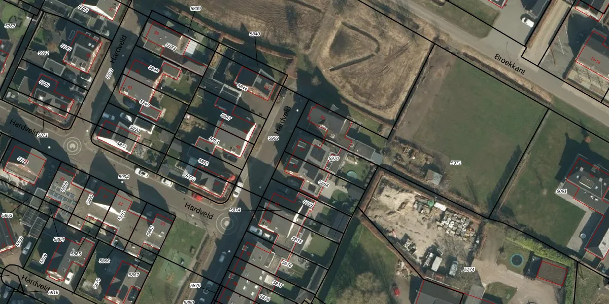 Hardveld 57 is gelegen op kadastraal perceel SDL00E5970. Deze kadastrale aanduiding is uniek en wordt gebruikt door het Kadaster om eigendomsrechten en andere zakelijke rechten vast te leggen. Het perceel maakt onderdeel uit van de kadastrale gemeente Schijndel.