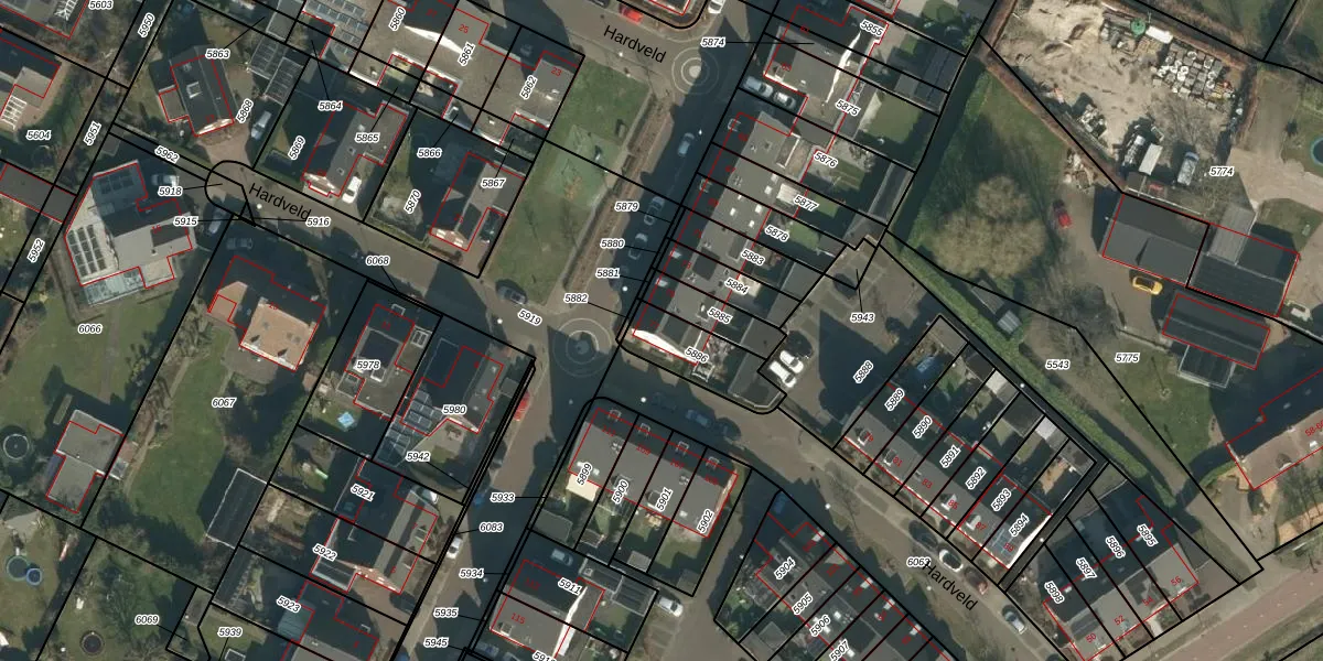 Het perceel waarop Hardveld 77 staat heeft een oppervlakte van 187 m². Dit is een middelgroot perceel. De perceeloppervlakte wordt geregistreerd door het Kadaster. Gedetailleerde informatie over de maten van dit perceel kunt u vinden in het rapport Kadastrale kaart met maatvoering van Hardveld 77.
