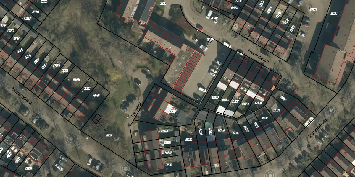Haydnstraat 100-08 is gelegen op kadastraal perceel SDL00G5162. Deze kadastrale aanduiding is uniek en wordt gebruikt door het Kadaster om eigendomsrechten en andere zakelijke rechten vast te leggen. Het perceel maakt onderdeel uit van de kadastrale gemeente Schijndel.