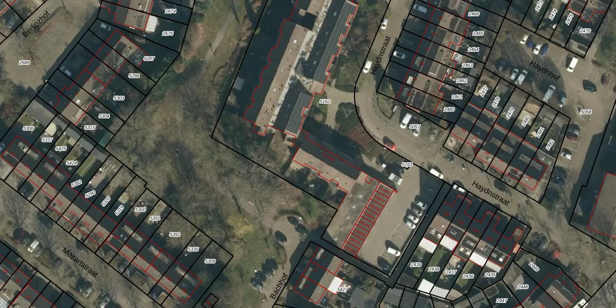 Het perceel waarop Haydnstraat 96 staat heeft een oppervlakte van 4024 m². Dit is een zeer groot perceel. De perceeloppervlakte wordt geregistreerd door het Kadaster. Gedetailleerde informatie over de maten van dit perceel kunt u vinden in het rapport Kadastrale kaart met maatvoering van Haydnstraat 96.