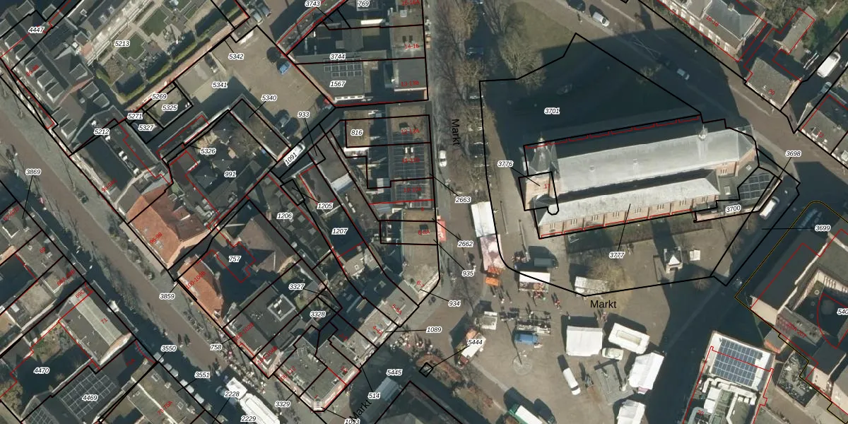 Het perceel waarop Markt 9 staat heeft een oppervlakte van 182 m². Dit is een middelgroot perceel. De perceeloppervlakte wordt geregistreerd door het Kadaster. Gedetailleerde informatie over de maten van dit perceel kunt u vinden in het rapport Kadastrale kaart met maatvoering van Markt 9.