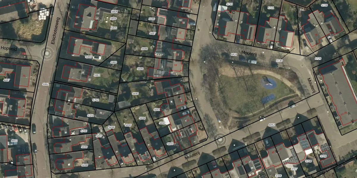 Het perceel waarop Mouterij 16 staat heeft een oppervlakte van 492 m². Dit is een groot perceel. De perceeloppervlakte wordt geregistreerd door het Kadaster. Gedetailleerde informatie over de maten van dit perceel kunt u vinden in het rapport Kadastrale kaart met maatvoering van Mouterij 16.