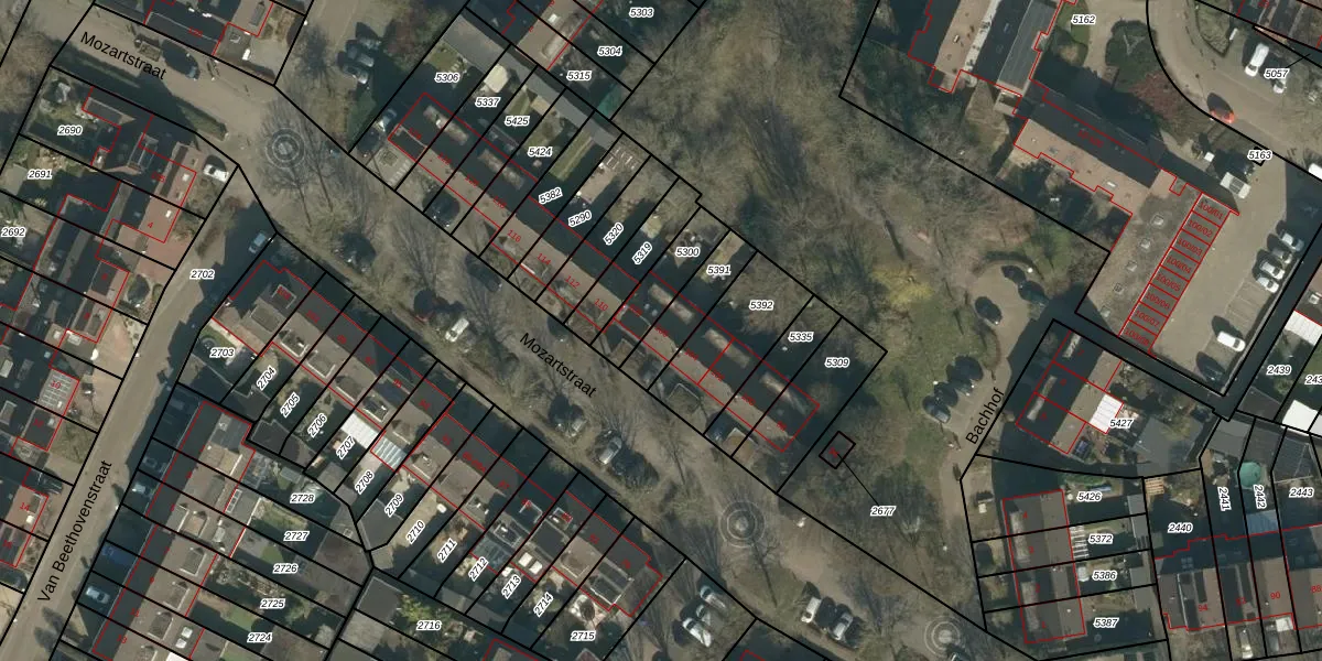 Mozartstraat 106 is gelegen op kadastraal perceel SDL00G5391. Deze kadastrale aanduiding is uniek en wordt gebruikt door het Kadaster om eigendomsrechten en andere zakelijke rechten vast te leggen. Het perceel maakt onderdeel uit van de kadastrale gemeente Schijndel.