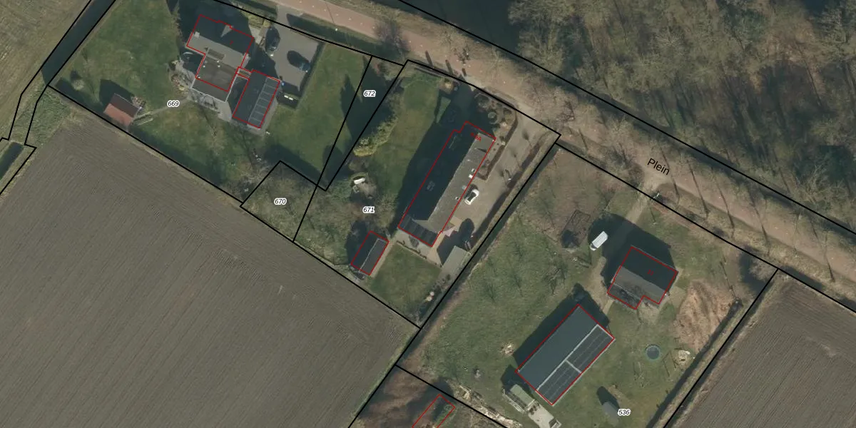 Het perceel waarop Plein 9-A staat heeft een oppervlakte van 2047 m². Dit is een zeer groot perceel. De perceeloppervlakte wordt geregistreerd door het Kadaster. Gedetailleerde informatie over de maten van dit perceel kunt u vinden in het rapport Kadastrale kaart met maatvoering van Plein 9-A.