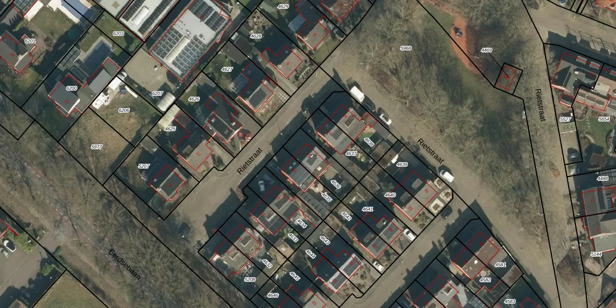 Rietstraat 25 is gelegen op kadastraal perceel SDL00E4636. Deze kadastrale aanduiding is uniek en wordt gebruikt door het Kadaster om eigendomsrechten en andere zakelijke rechten vast te leggen. Het perceel maakt onderdeel uit van de kadastrale gemeente Schijndel.