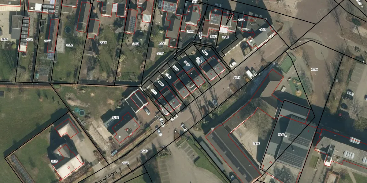 Schoolstraat 9 is gelegen op kadastraal perceel SDL00G5049. Deze kadastrale aanduiding is uniek en wordt gebruikt door het Kadaster om eigendomsrechten en andere zakelijke rechten vast te leggen. Het perceel maakt onderdeel uit van de kadastrale gemeente Schijndel.