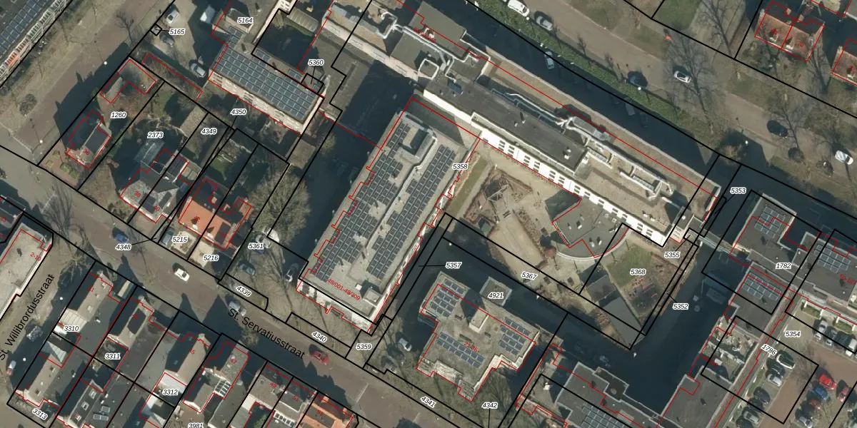 Het perceel waarop St. Servatiusstraat 48-106 staat heeft een oppervlakte van 4656 m². Dit is een zeer groot perceel. De perceeloppervlakte wordt geregistreerd door het Kadaster. Gedetailleerde informatie over de maten van dit perceel kunt u vinden in het rapport Kadastrale kaart met maatvoering van St. Servatiusstraat 48-106.