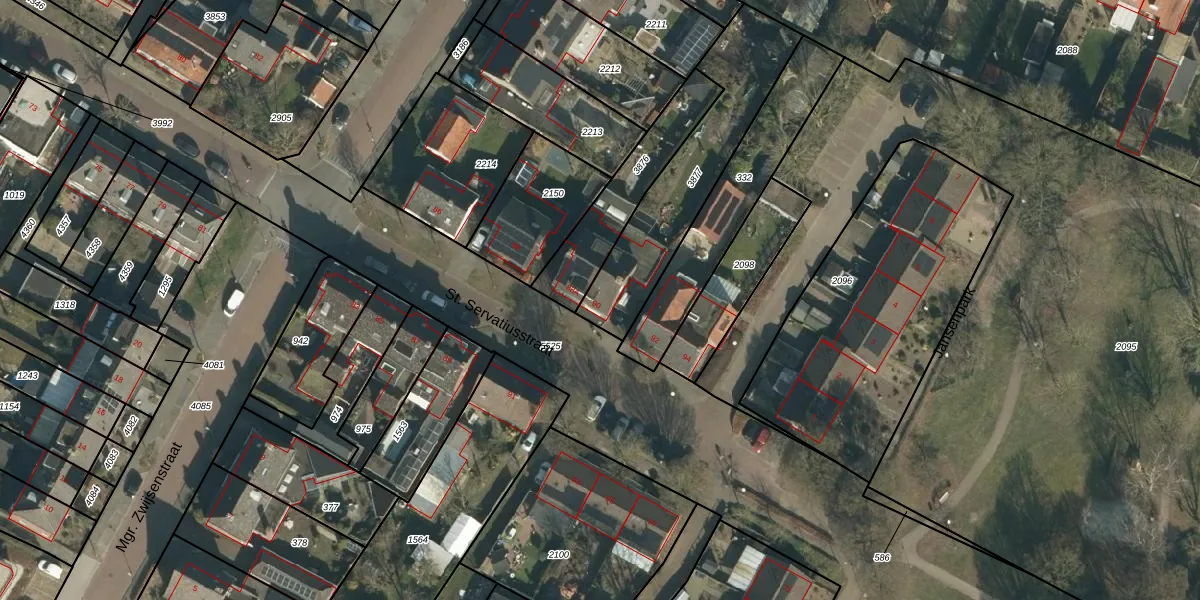Het perceel waarop St. Servatiusstraat 90 staat heeft een oppervlakte van 555 m². Dit is een groot perceel. De perceeloppervlakte wordt geregistreerd door het Kadaster. Gedetailleerde informatie over de maten van dit perceel kunt u vinden in het rapport Kadastrale kaart met maatvoering van St. Servatiusstraat 90.