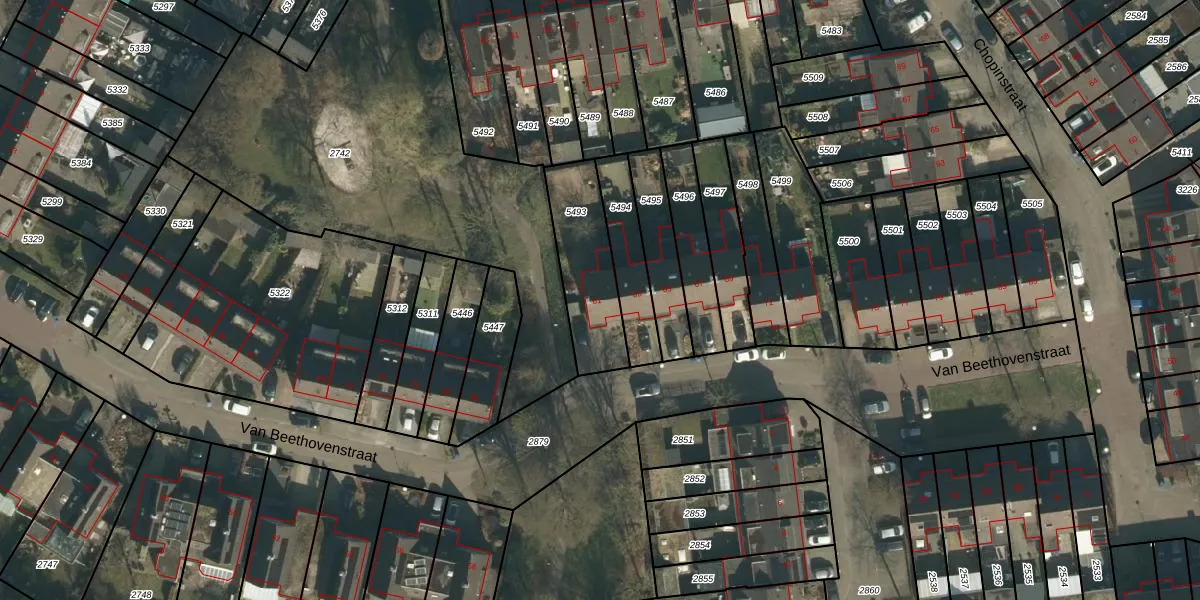 Het perceel waarop Van Beethovenstraat 61 staat heeft een oppervlakte van 310 m². Dit is een groot perceel. De perceeloppervlakte wordt geregistreerd door het Kadaster. Gedetailleerde informatie over de maten van dit perceel kunt u vinden in het rapport Kadastrale kaart met maatvoering van Van Beethovenstraat 61.