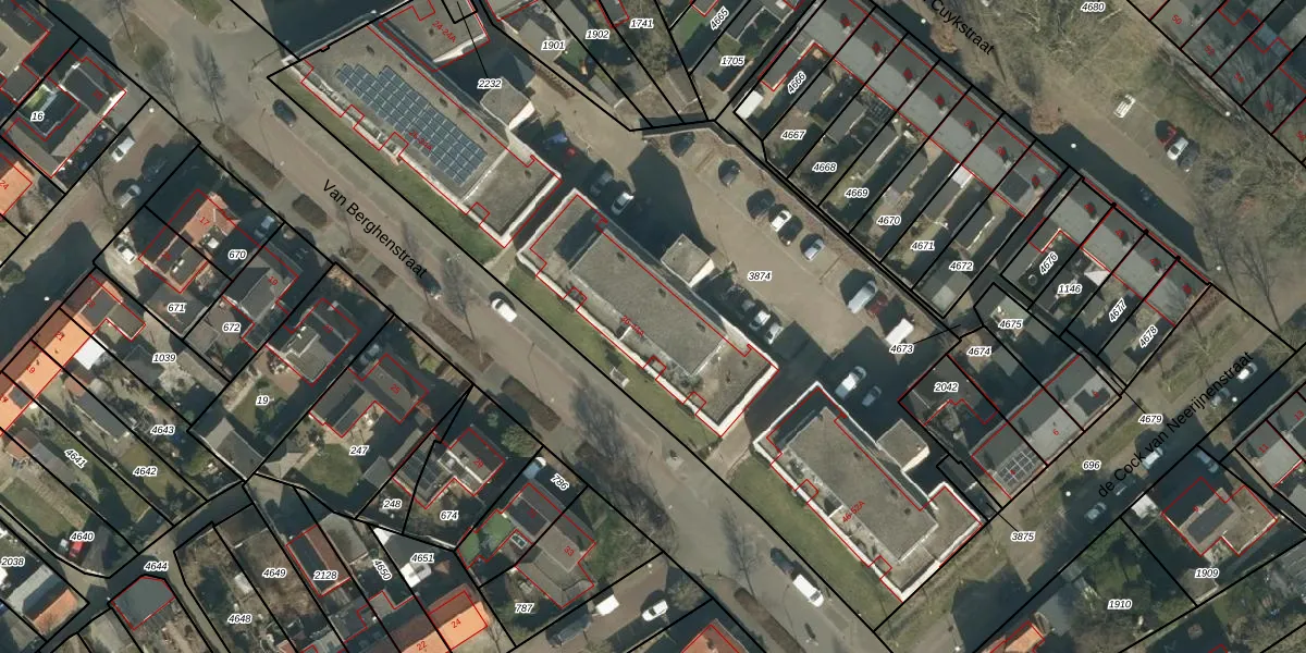 Het perceel waarop Van Berghenstraat 40-A staat heeft een oppervlakte van 4070 m². Dit is een zeer groot perceel. De perceeloppervlakte wordt geregistreerd door het Kadaster. Gedetailleerde informatie over de maten van dit perceel kunt u vinden in het rapport Kadastrale kaart met maatvoering van Van Berghenstraat 40-A.