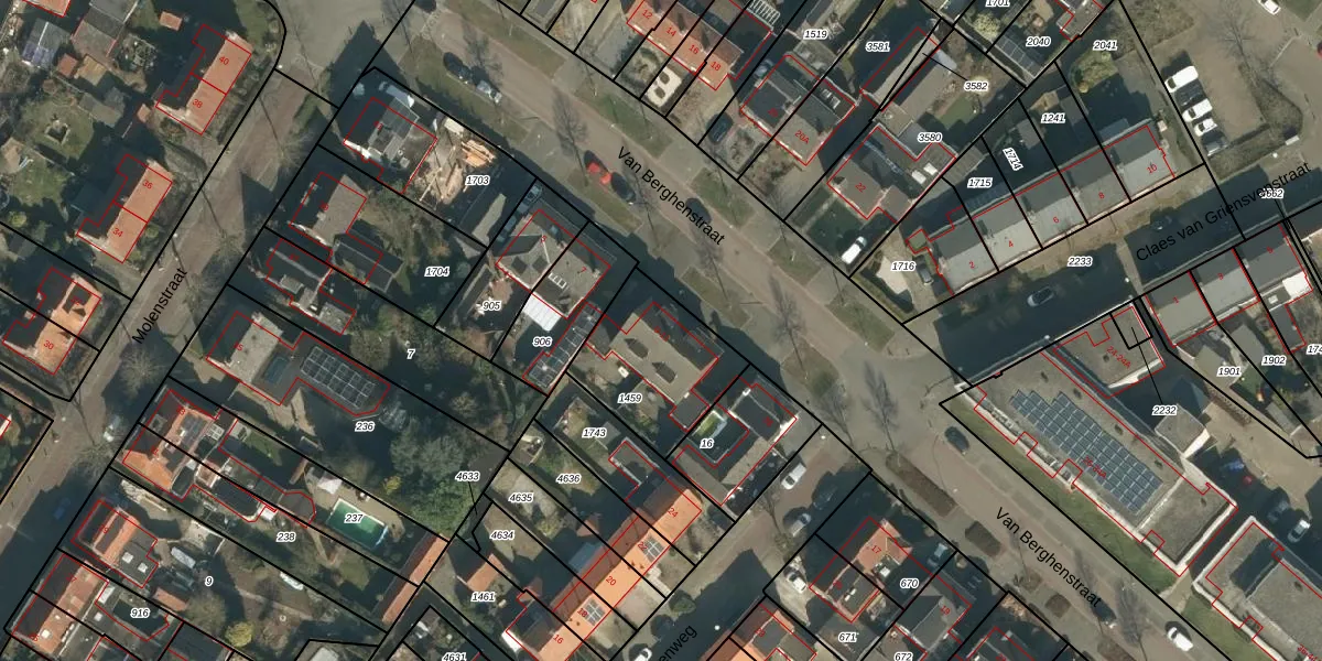 Het perceel waarop Van Berghenstraat 9 staat heeft een oppervlakte van 419 m². Dit is een groot perceel. De perceeloppervlakte wordt geregistreerd door het Kadaster. Gedetailleerde informatie over de maten van dit perceel kunt u vinden in het rapport Kadastrale kaart met maatvoering van Van Berghenstraat 9.