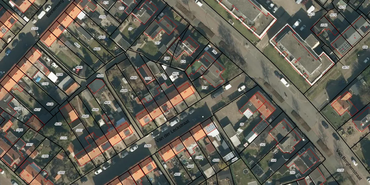 Van der Leckstraat 24 is gelegen op kadastraal perceel SDL00G4651. Deze kadastrale aanduiding is uniek en wordt gebruikt door het Kadaster om eigendomsrechten en andere zakelijke rechten vast te leggen. Het perceel maakt onderdeel uit van de kadastrale gemeente Schijndel.