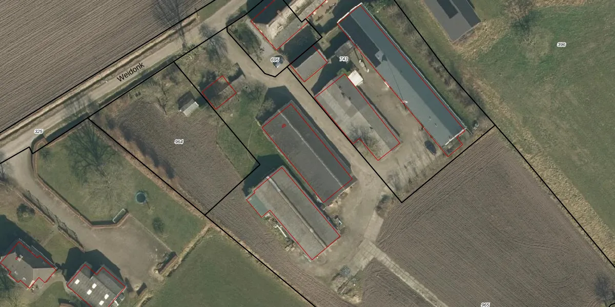 Het perceel waarop Weidonk 4-B staat heeft een oppervlakte van 9826 m². Dit is een zeer groot perceel. De perceeloppervlakte wordt geregistreerd door het Kadaster. Gedetailleerde informatie over de maten van dit perceel kunt u vinden in het rapport Kadastrale kaart met maatvoering van Weidonk 4-B.