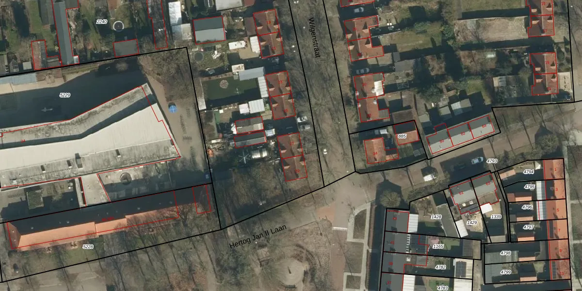 Het perceel waarop Wilgenstraat 27 staat heeft een oppervlakte van 7689 m². Dit is een zeer groot perceel. De perceeloppervlakte wordt geregistreerd door het Kadaster. Gedetailleerde informatie over de maten van dit perceel kunt u vinden in het rapport Kadastrale kaart met maatvoering van Wilgenstraat 27.