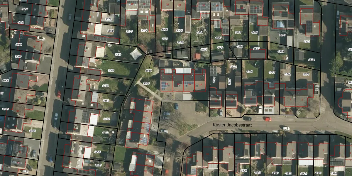 Het perceel waarop Koster Jacobsstraat 18 staat heeft een oppervlakte van 3145 m². Dit is een zeer groot perceel. De perceeloppervlakte wordt geregistreerd door het Kadaster. Gedetailleerde informatie over de maten van dit perceel kunt u vinden in het rapport Kadastrale kaart met maatvoering van Koster Jacobsstraat 18.