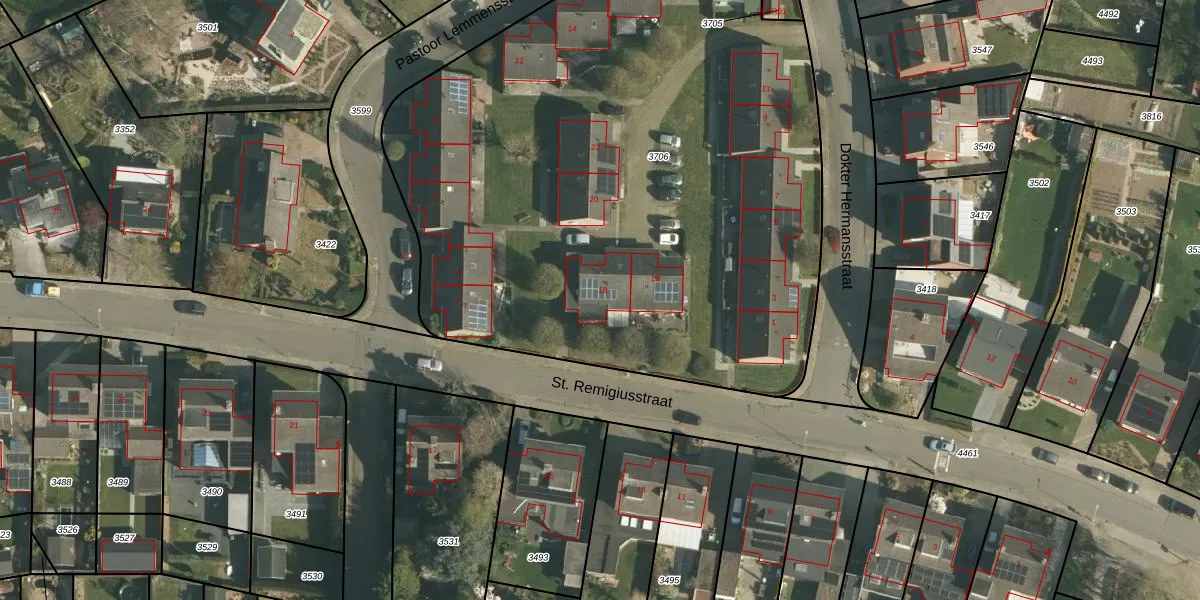 Het perceel waarop St. Remigiusstraat 18 staat heeft een oppervlakte van 4386 m². Dit is een zeer groot perceel. De perceeloppervlakte wordt geregistreerd door het Kadaster. Gedetailleerde informatie over de maten van dit perceel kunt u vinden in het rapport Kadastrale kaart met maatvoering van St. Remigiusstraat 18.