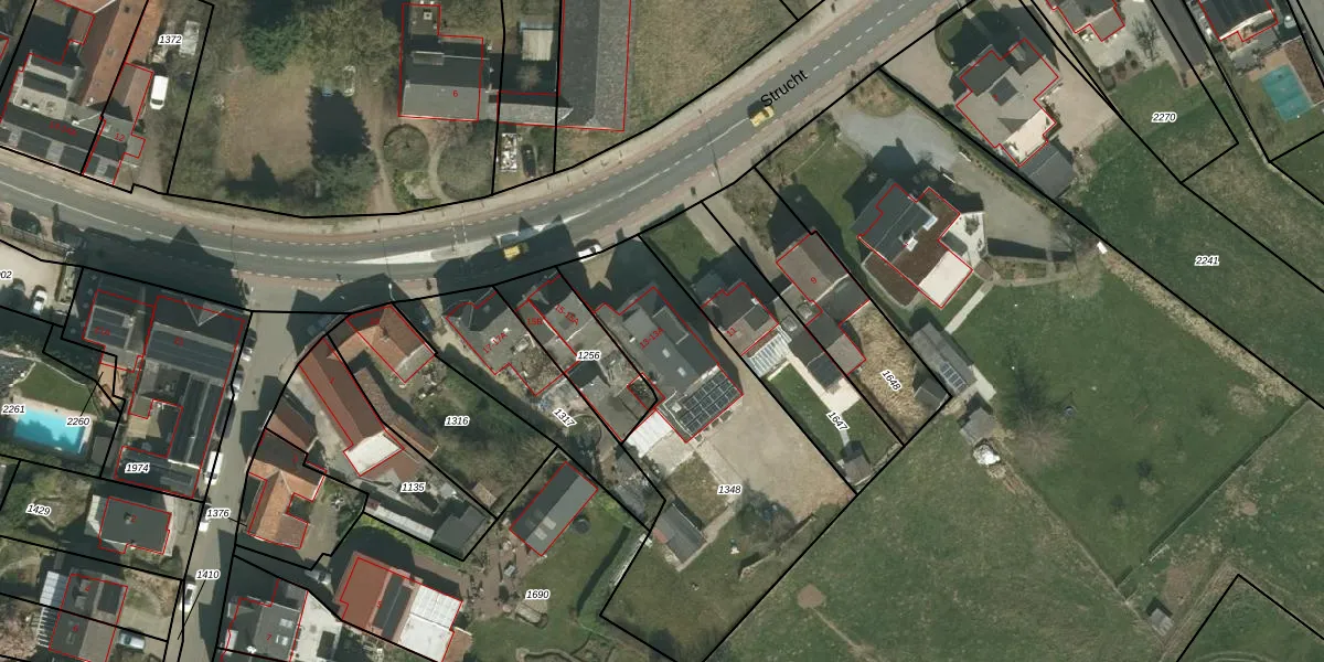 Strucht 13-A is gelegen op kadastraal perceel SCH02C1348. Deze kadastrale aanduiding is uniek en wordt gebruikt door het Kadaster om eigendomsrechten en andere zakelijke rechten vast te leggen. Het perceel maakt onderdeel uit van de kadastrale gemeente Schin op Geul.