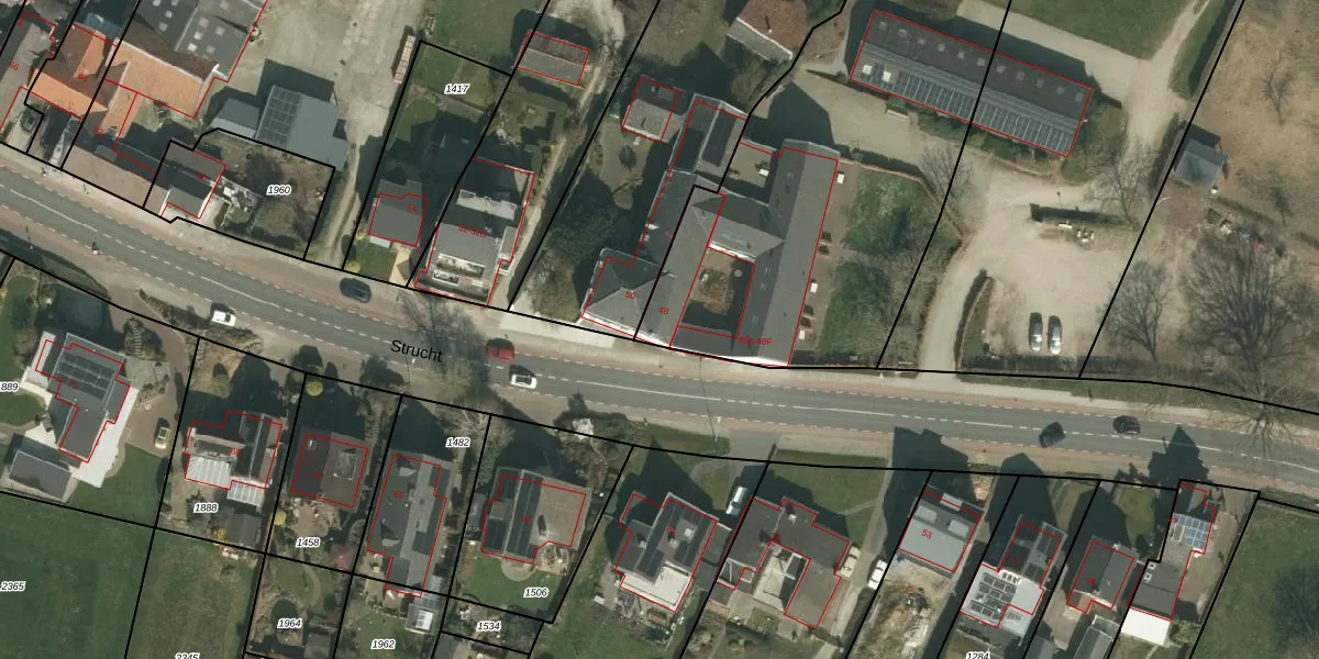 Het perceel waarop Strucht 48 staat heeft een oppervlakte van 3590 m². Dit is een zeer groot perceel. De perceeloppervlakte wordt geregistreerd door het Kadaster. Gedetailleerde informatie over de maten van dit perceel kunt u vinden in het rapport Kadastrale kaart met maatvoering van Strucht 48.